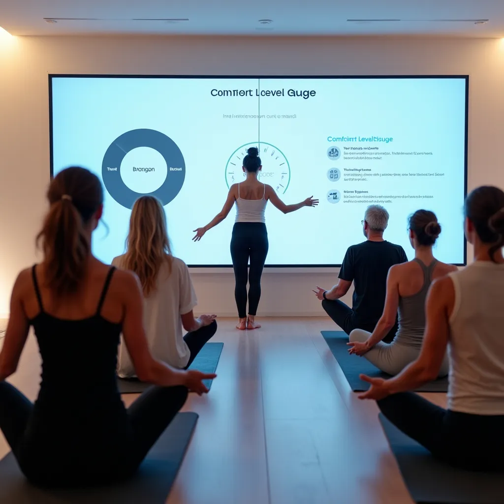 Antes de cada sesión, utilizamos el "Comfort Level Gauge" para determinar tu nivel de comodidad. Esto nos permite adaptar las posturas y ejercicios en función de tu bienestar ese día.